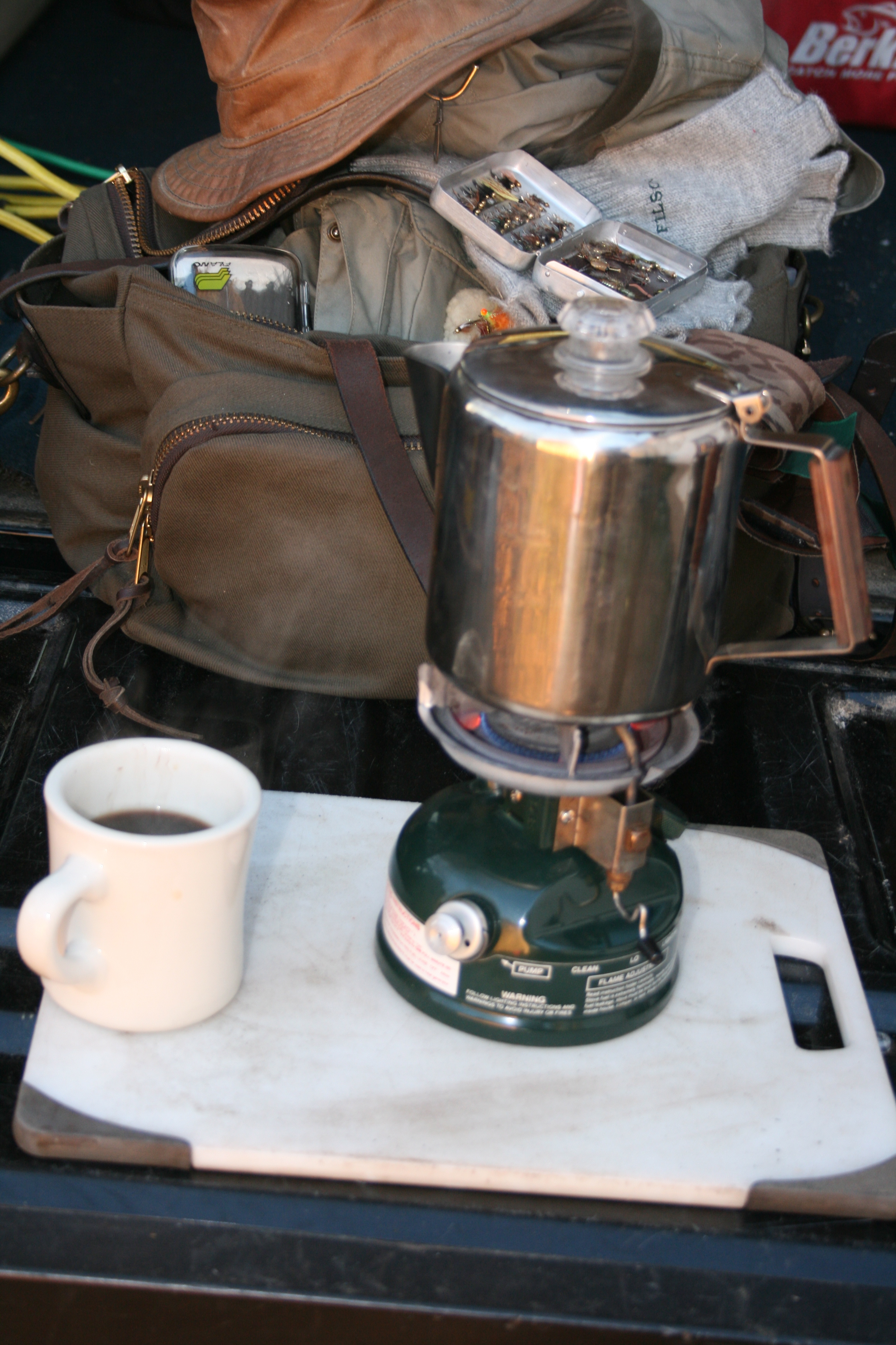 The stove and tailgate coffee fixings have been part of my regular fishing gear for several seasons. The recipe is as simple as the idea: 1 1/2 scoops (cir. 3 tablespoons) of ground coffee and water. Heat to a boil. Drink immediately.