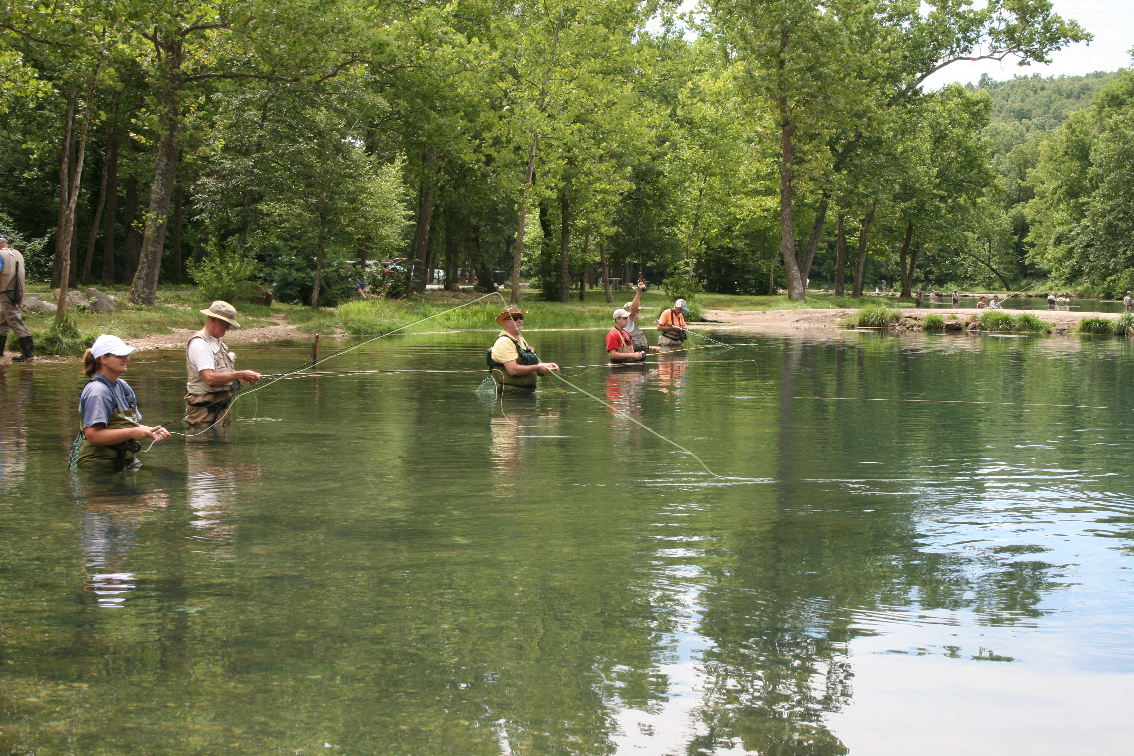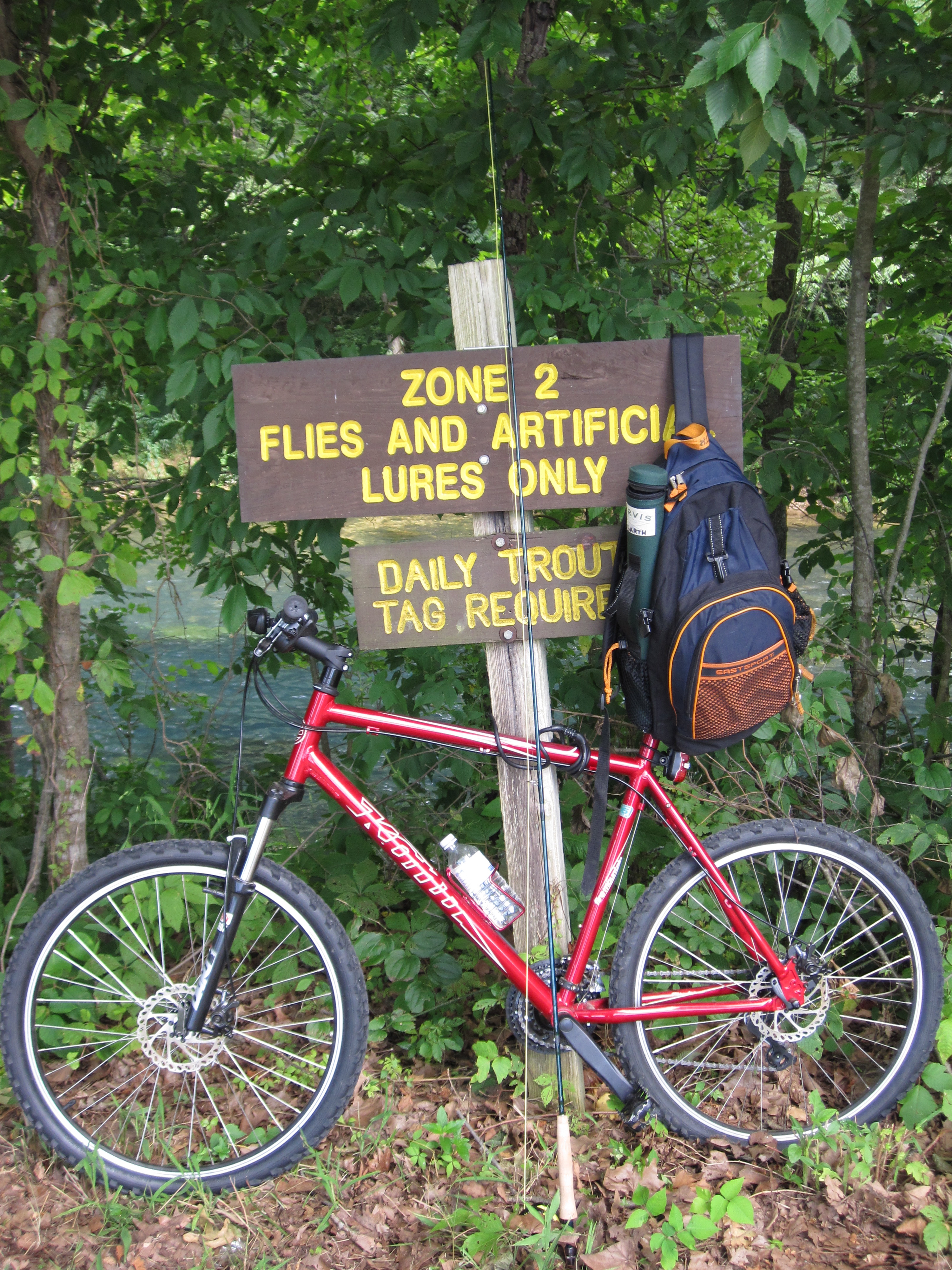 It’s the last day of a three-day trip to Missouri’s Bennett Spring State Park wwwmostateparks.com/Bennett.htm. For the last round of fishing I am traveling by bike, working my way downstream from the “fly only” section that starts at the 100 million gallon per hour spring to the “bait only” piece of water near where the stream exits the park and where Vic Eckmann (a bait specialist who works at the park store) says he can catch four fish on four cast nearly at will. I’m currently working in the “fly or artificial lure only” section of the stream. No one is catching fish at will.