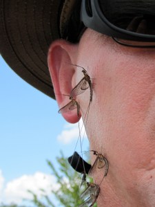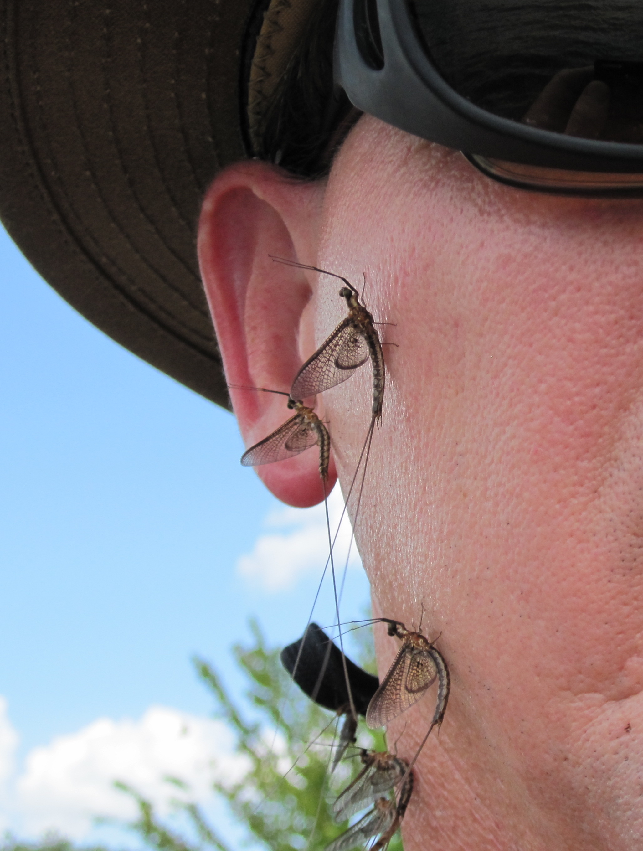 Later, at home while uploading the pictures to my computer, one of my daughters sauntered into my office and asked what I was doing. I told her about the mayflies and clicked on a self-portrait which showed some mayflies crawling on my cheek and neck.