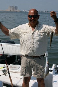 We caught some white trout, a few black-tip sharks and some Spanish mackerel; not a bad day considering we were fishing under a cloudless sky following a full moon. The best part of the day was following schools of blood minnows (which we first mistook as an oil sheen).