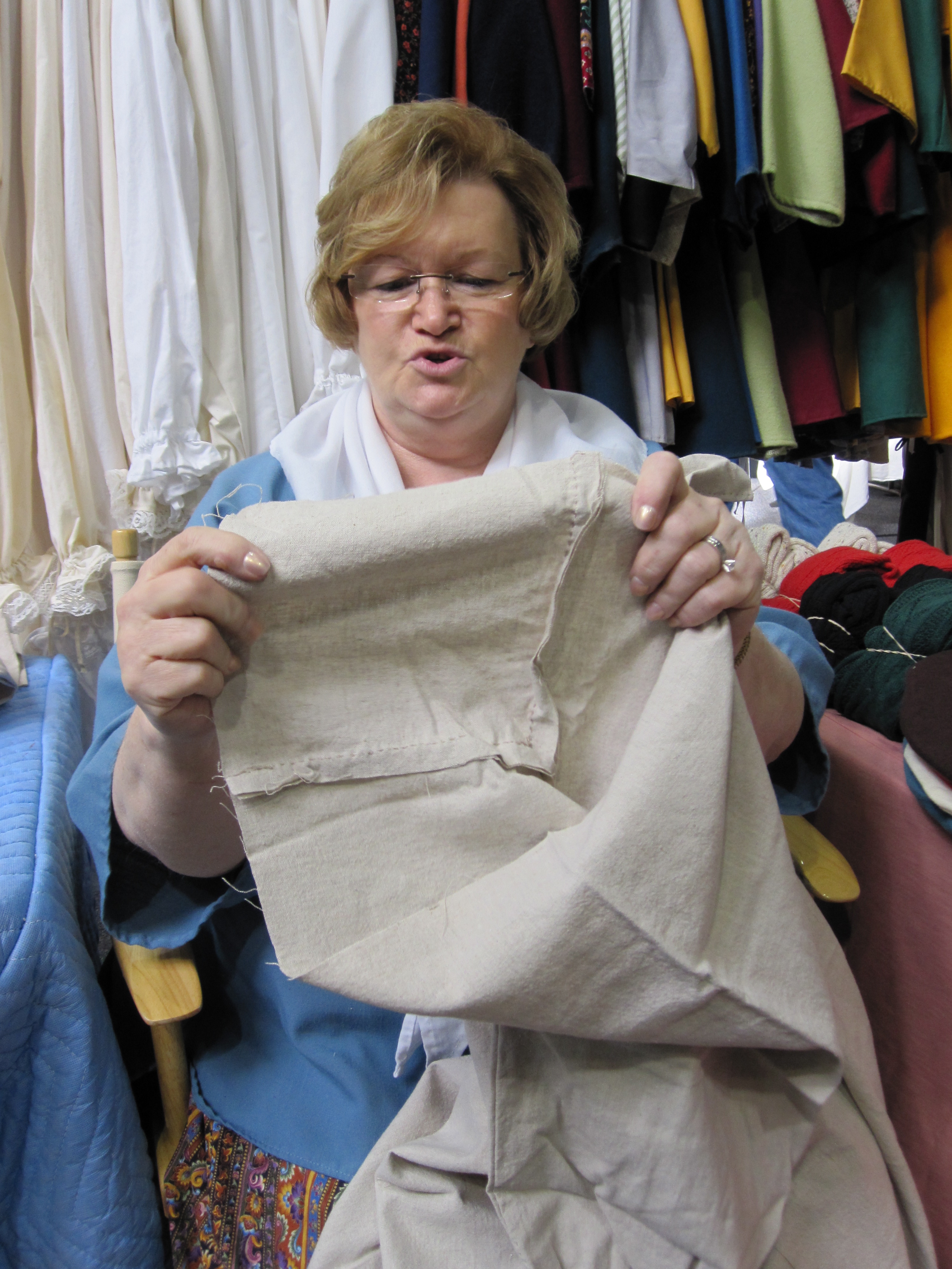 I discovered Patty Hughes (pictured) quietly working with a needle and thread behind a rack of clothing that would have been at home in any frontiersman’s cabin. As a seamstress her talents would have been highly valued in 1780. She was working on a trader’s shirt.