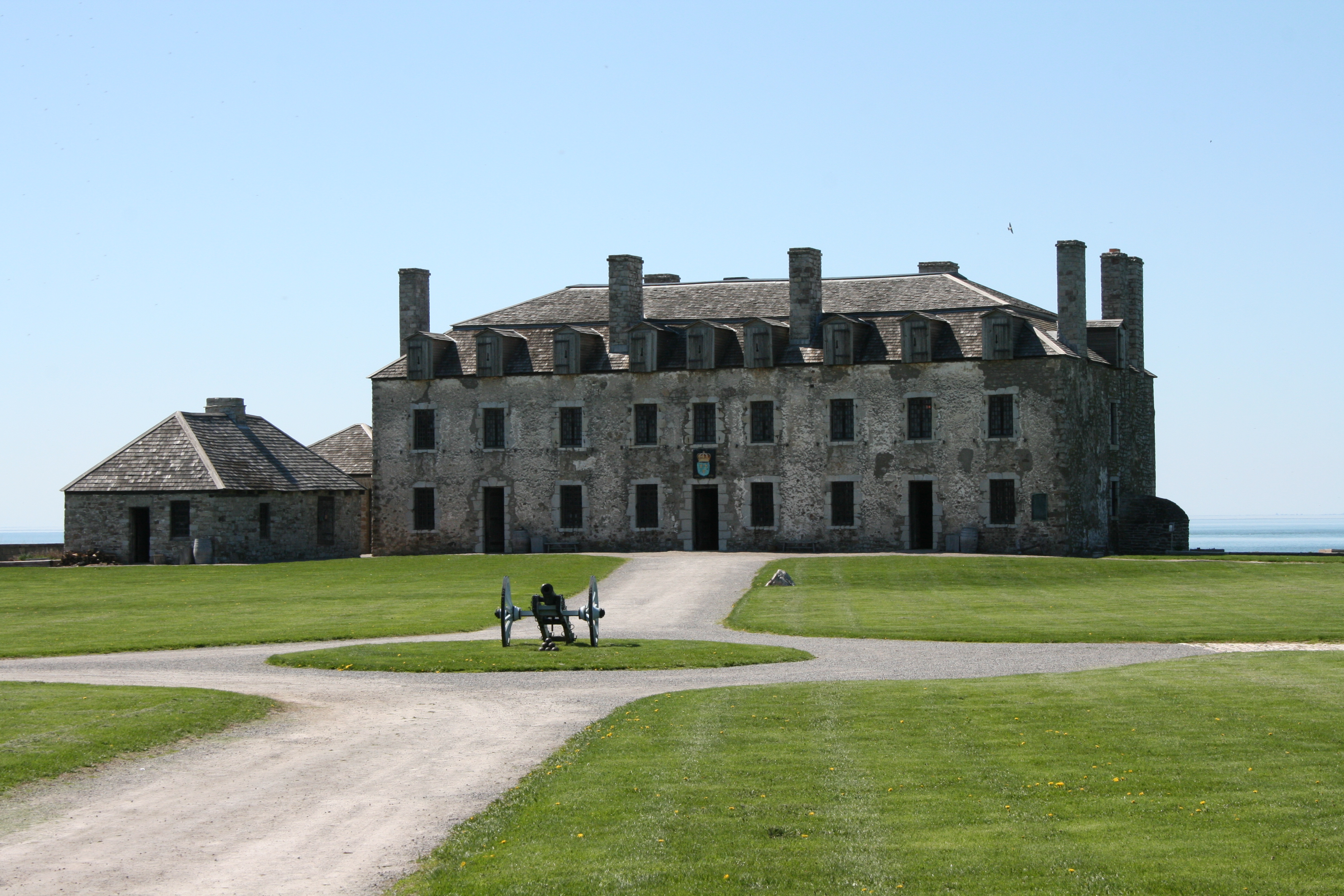 The Fort can trace its history to 1679, when the French established Ft. Conti, a trading post. That outpost didn’t last long nor did the Ft. Denonville, the one that followed it. But in 1726, the French (who were still in charge but not for long) got down to business and built the Machicolated House, later dubbed “The Castle” by its American inhabitants. It’s easy to see why. That’s it in the photo. The buildings to the left came later.