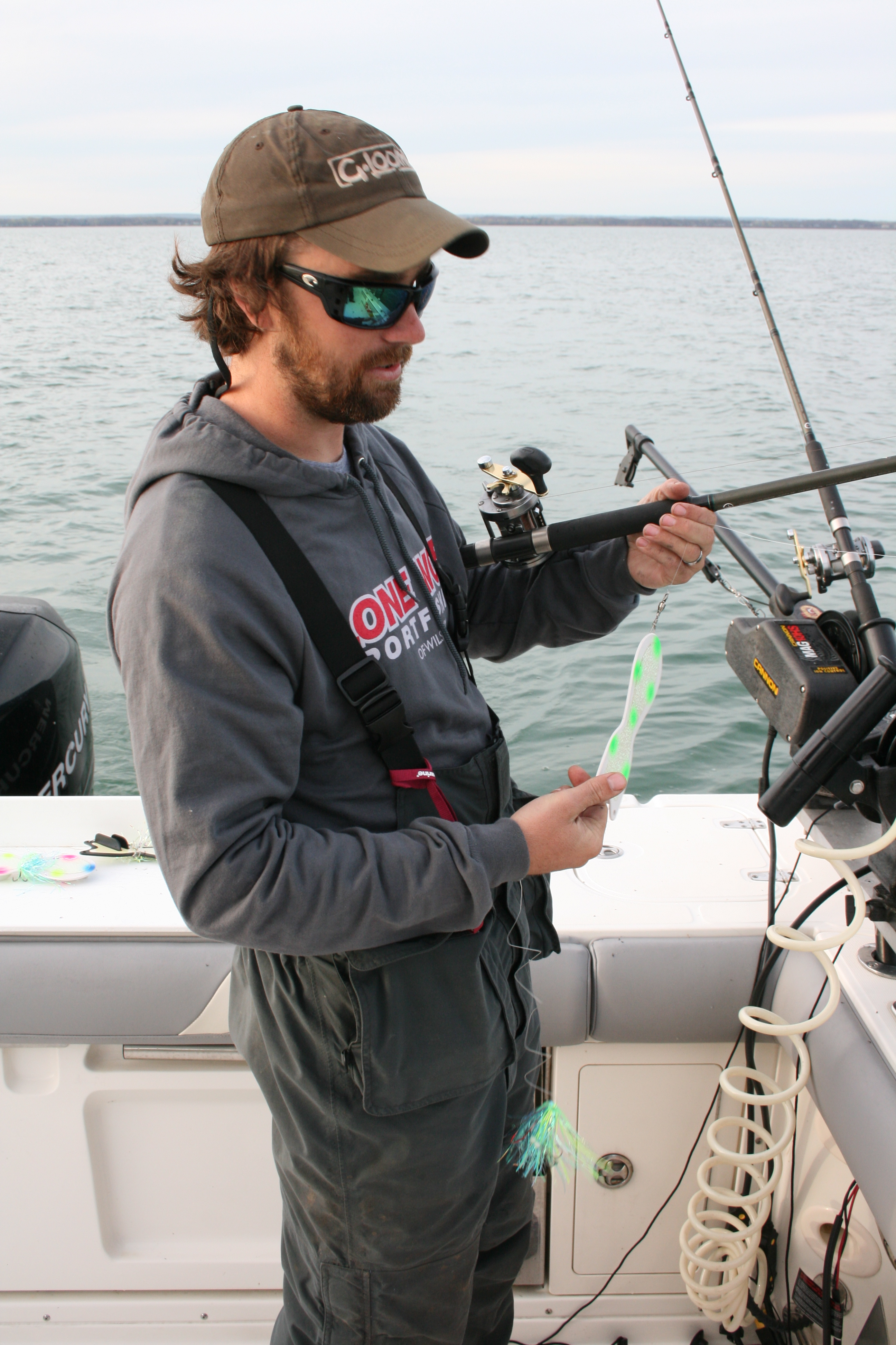 Hilts (that’s him in the photo) is an excellent charter captain – young (27) aggressive and skilled. He grew up fishing Lake Ontario and surrounding waters. Trolling for king salmon is one of his favorite ways to fish. However, the weather and the missing electronics (he was basically fishing blind with no accurate way to gauge the depth) combined to send us to the marina empty handed.