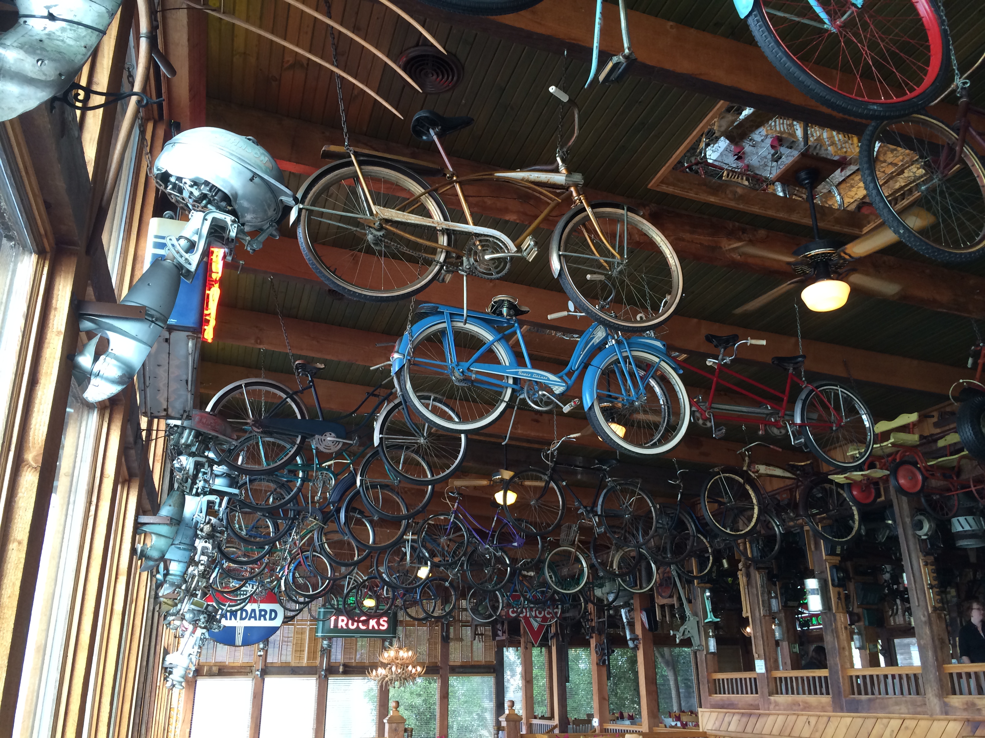 The dining room at Gaston’s White River Resort www.gastons.com is adorned with, among other things, an assortment of antique bicycles and tricycles, a row of Johnson outboard motors, a ancient motorcycle and a Standard Oil sign. These things hang from the ceiling.