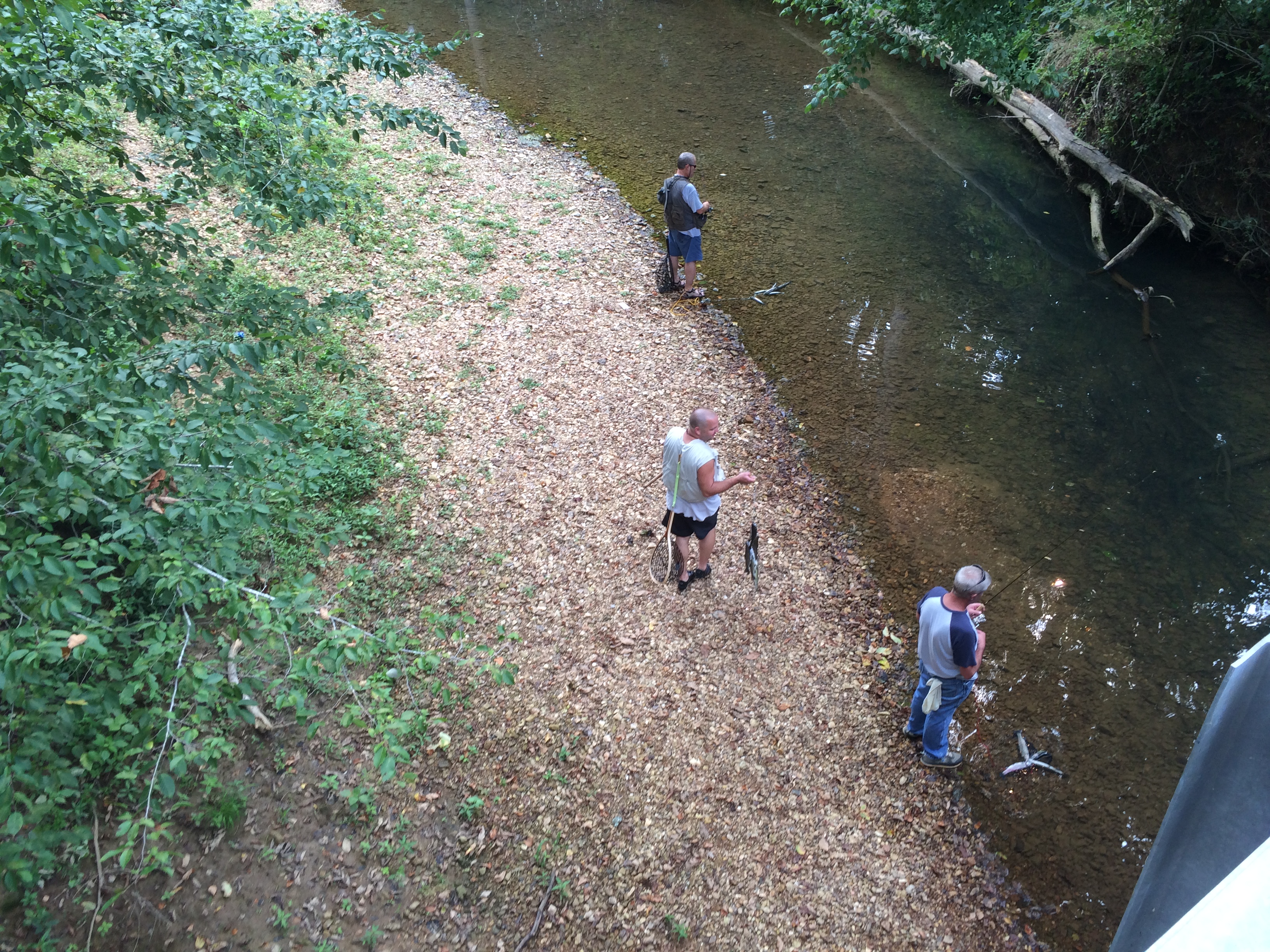 I walked toward the bridge. The creek became dark with trout, which were crowded into the deeper water that pools against the far bank. A guy dressed in tan shorts and a golf shirt, fly vest, wide-brimmed hat and oversized net was casting a chunk of shrimp into the pod of trout. He hooked three and landed one, adding it to the four he had clipped onto a metal stringer. Three other fishermen stood shoulder to shoulder. An older man was sitting on a step stool he’s positioned under the bridge. Two guys were on the downstream side of the stocking site but all were within casting distance of each other.