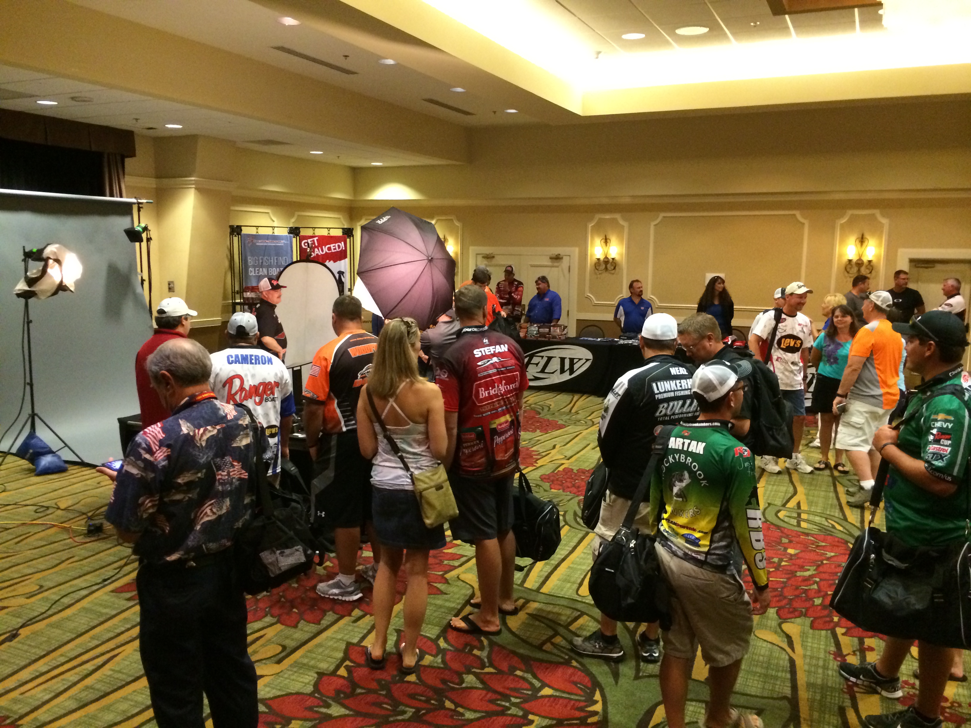 COLUMBIA, S. C. – During Wednesday’s registration for Thursday’s opening of the FLW Forrest Wood Cup bass fishing championship on Lake Murray the atmosphere was mostly relaxed and jovial. Anglers wandered in and out of the hotel conference room where registration tables lined one wall. In a corner of the room a couple of FLW pr guys were doing a podcast and in another corner an ongoing radio interview was being conducted with a revolving door of fishermen/guests. A few fans milled around, clicking photos with their phones.